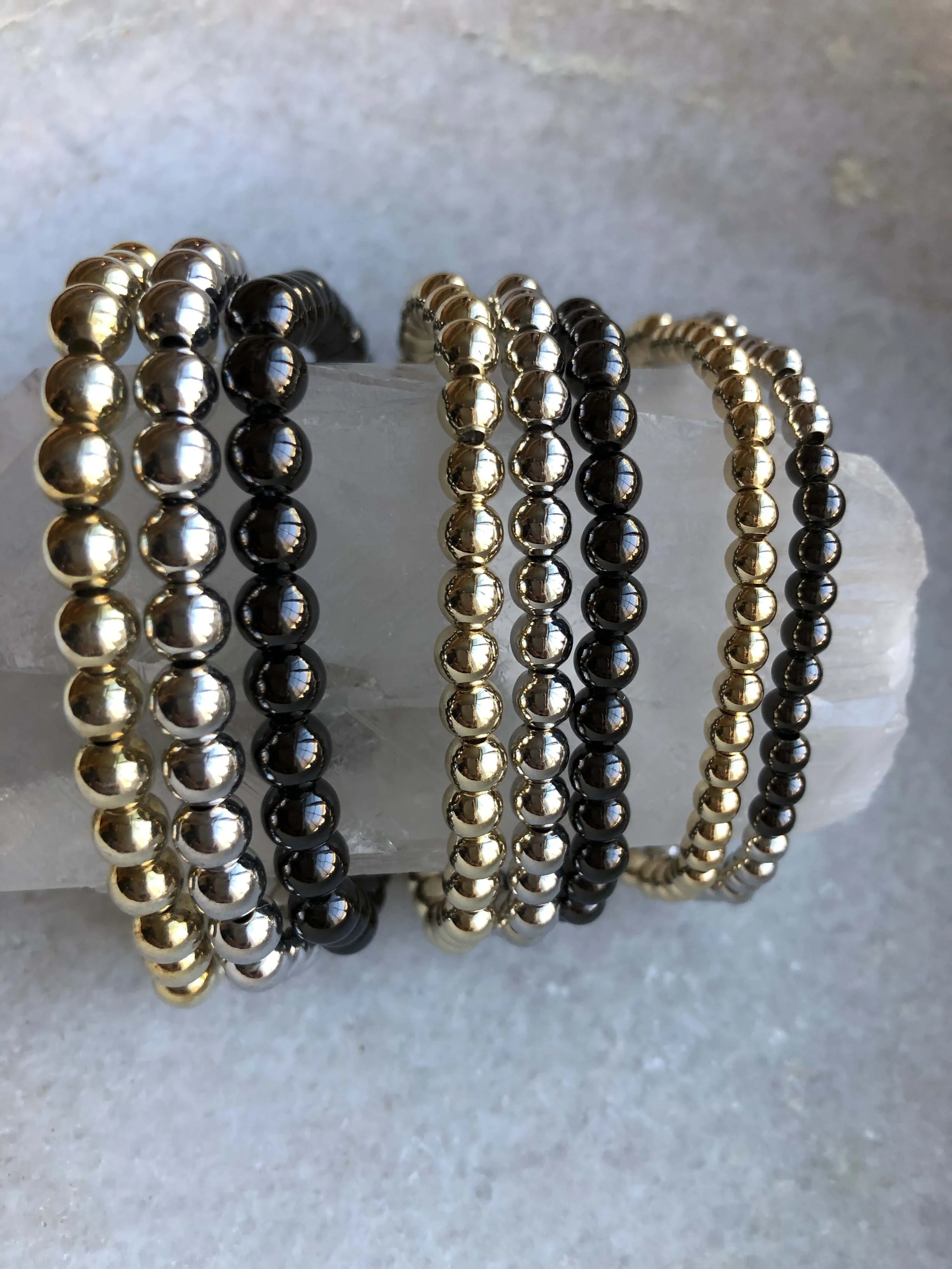 Align Bracelets Shop › RHODIUM COLLECTION Image 1 of 4 Image 2 of 4 Image 3 of 4 Image 4 of 4 RHODIUM COLLECTION $14.00 Rhodium plated over copper. Finishes shown (from left to right) are gold, silver and gunmetal. Finish: Select Finish Gold Silver Gunmetal Bead Size: Select Bead Size 3mm 4mm Wrist Size: Select Wrist Size 6" 6.5" 7" 7.5" 8" Quantity: Purchase Added! Rhodium plated over copper. Finishes shown (from left to right) are gold, silver and gunmetal.